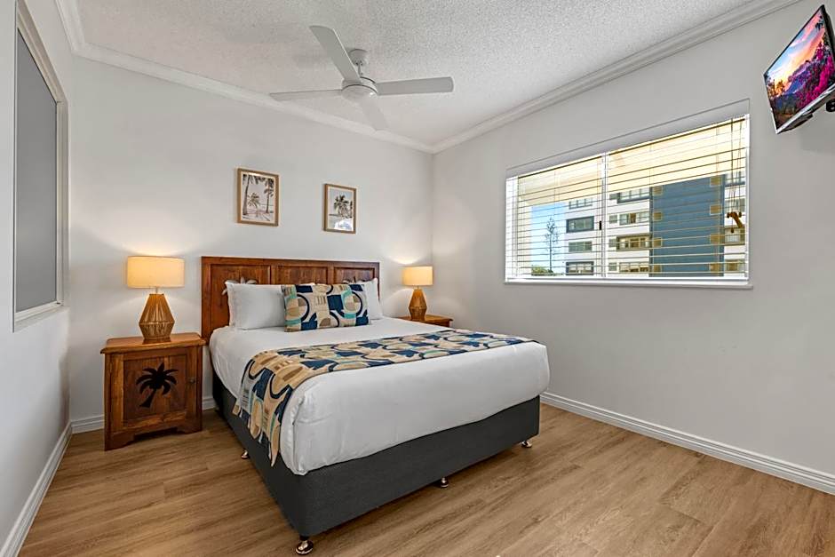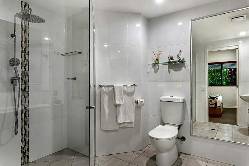 This airconditioned fully self contained apartment has a spacious living area & balcony. Bathroom is either a shower over a 2-person spa bath or a walk in shower.